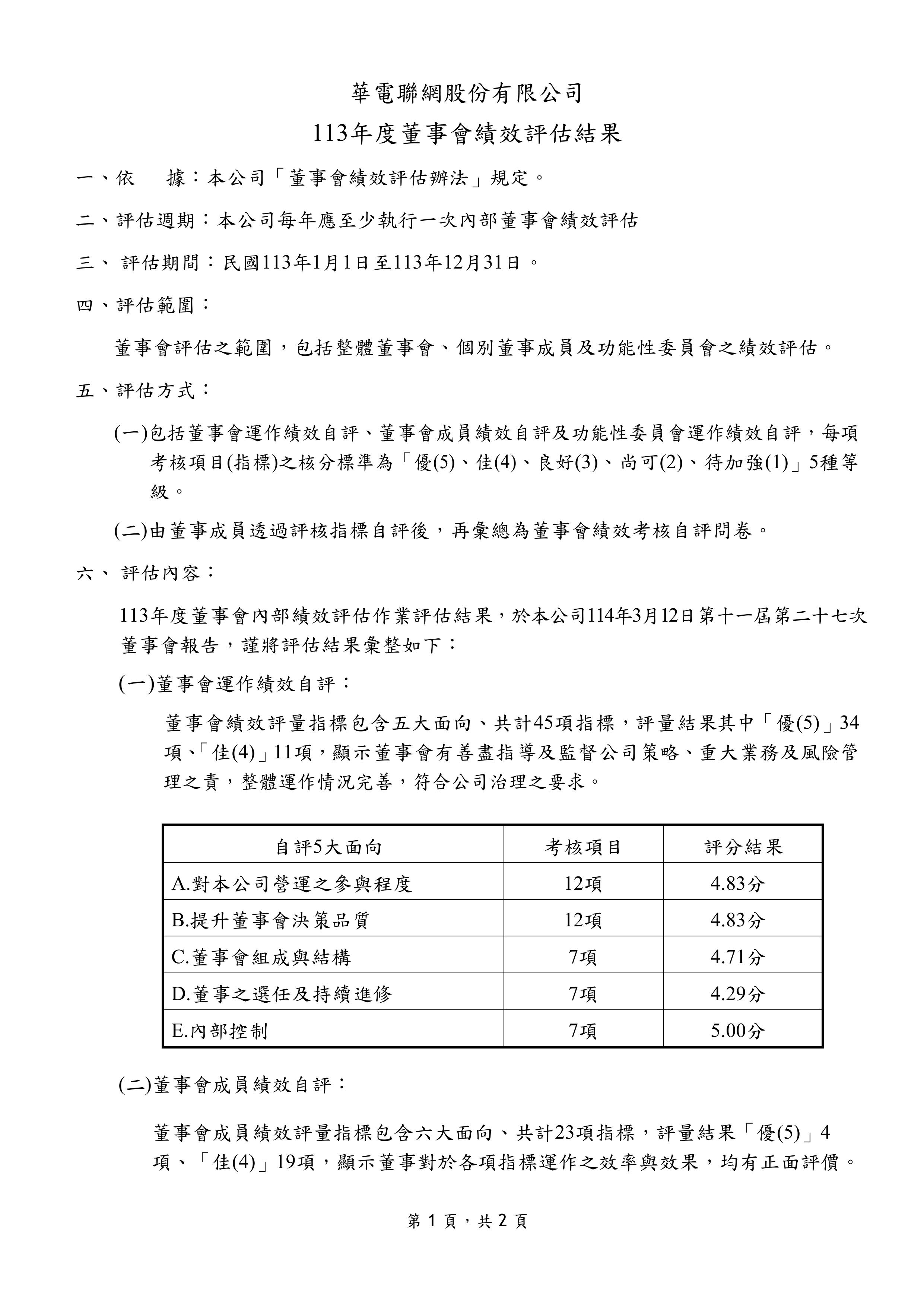(2)個別董事成員績效評估:包括公司目標與任務之掌握、董事職責認知、對公司營運之參與程度、內部關係經營與溝通、董事之專業及持續進修、內部控制等。